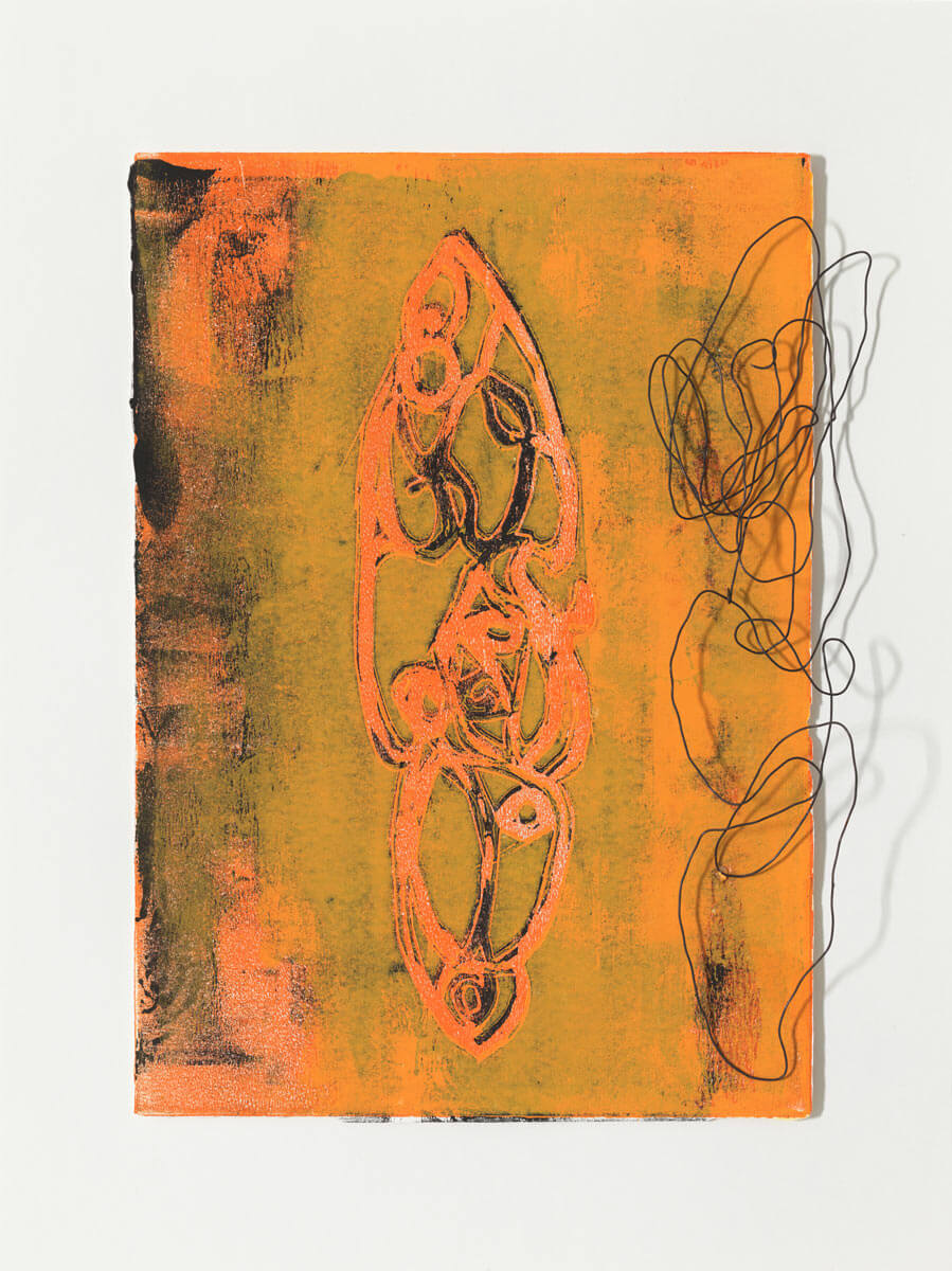 Artefakt 1, 2021, Linoldruck auf Papier, Draht, 30x40 cm